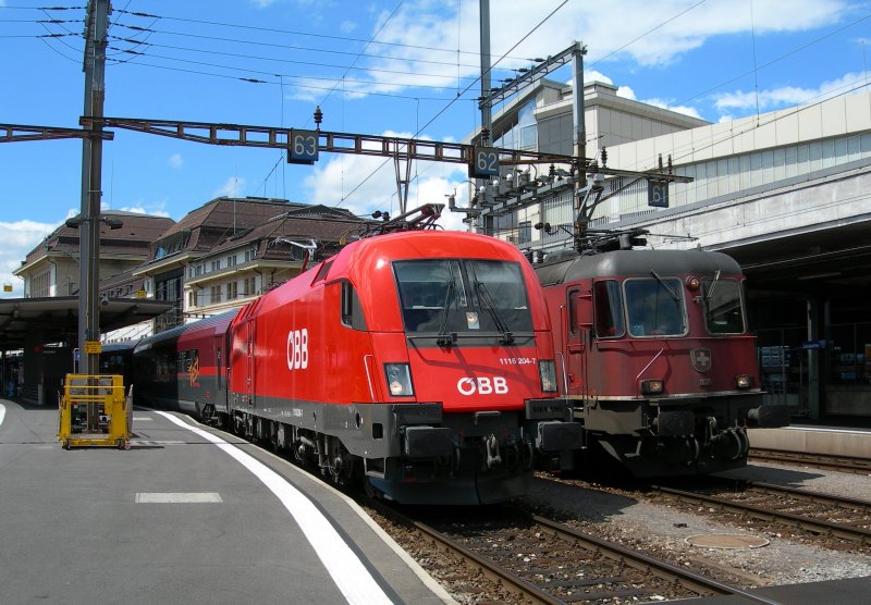 ÖBB 1116 204-7 mit Railjet-Testzug und im Hintergrund Re 6/6 11628 in Lausanne am 7. Juli 2008 (zum Bild)